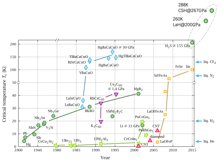 此后的一系列实验果然见证了快速提升的转变温度,直到最近前文提到的2019年那次200GPa压强下260~280K超导的镧化氢,以及刚刚发表的267GPa压强下288K超导的碳氢硫混合物。