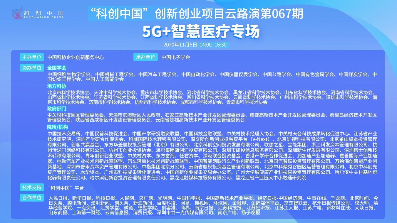 科创中国”系列路演活动第067期——创新创业项目5G+智慧医疗专场,将于2020年11月5日14:00至16:30开启线上直播。