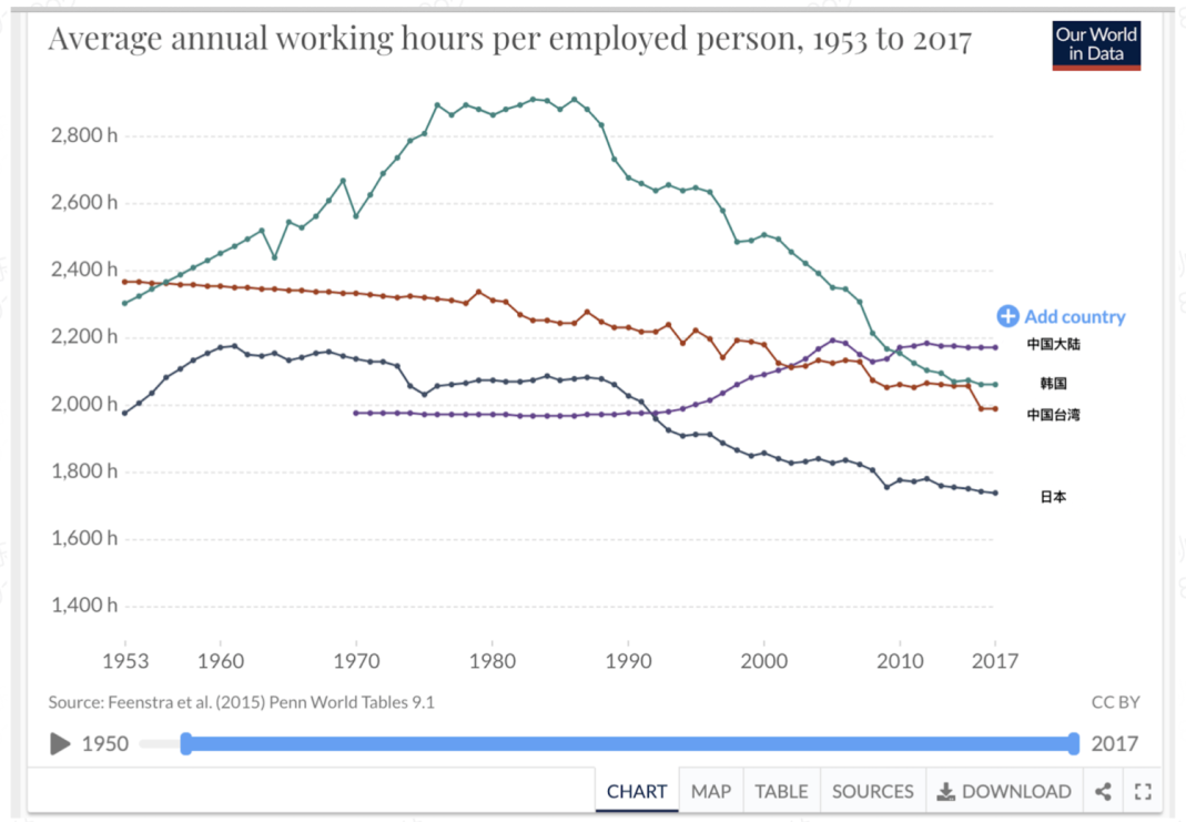 东亚终于看到了摩尔定律契约的反面:血酬。在工作时长上,东亚国家一骑绝尘,最热衷于发动价格战的韩国,工作时长一度达到恐怖的3000小时,是德国工作时长两倍多,巅峰时期的韩国,更是达到了全民996的地步。