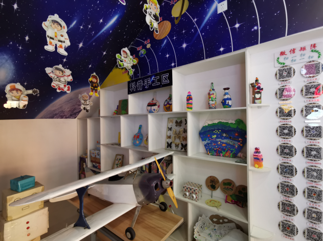 走进盈北社区“青少年之家”,占地 830 平米的活动区域配置了LED 显示屏、报刊书籍、各类益智玩具、科普仪器、科普e站电子设备等,楼梯一角的科普手工区摆满了孩子们自主创作的优秀手工作品。