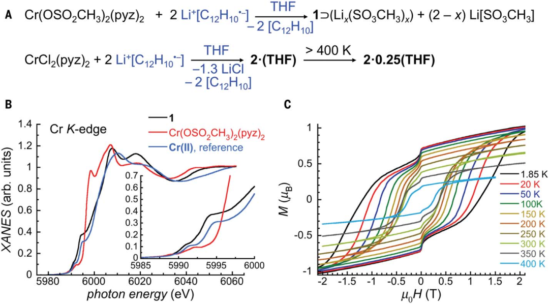 在THF中,通过2倍量Li+[C12H12·-]-对Cr-吡嗪配合物进行还原,Cr(OSO2CH3)2(pyz)2变成空气敏感的深灰色粉末材料,XRD表征结果显示,材料中产生Li[SO3CH3]的衍射峰,说明Cr-吡嗪中的OSO2CH3-阴离子从材料中脱除。进一步的表征发现,OSO2CH3脱除后,Cr-吡嗪变为无定形结构CrII(pyz)2·-。临界温度提高至400 K,展现了硬磁体效应(300 K,3400 Oe)。