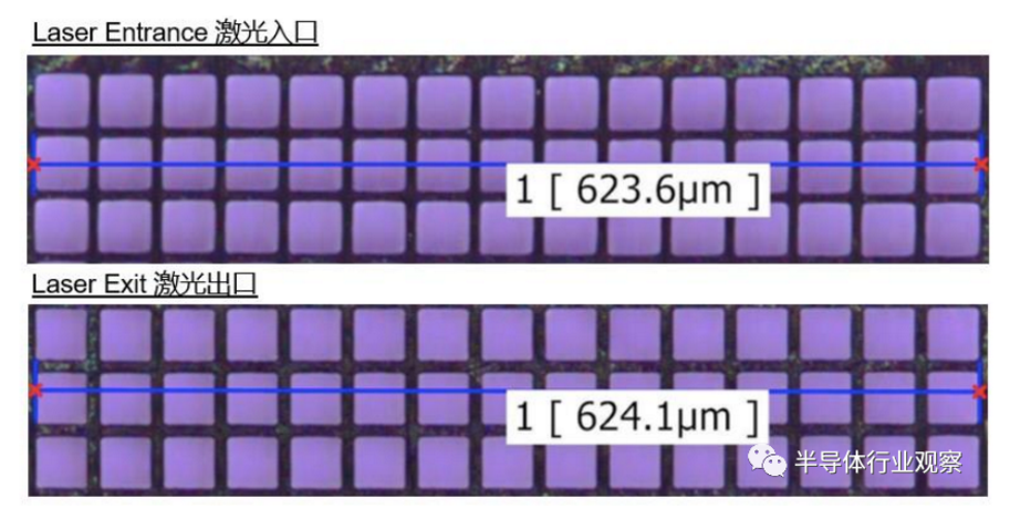 除了呈现倍数增长的效率,激光加工的一致性与可靠性,也是我们的探针卡用户所重视的。试想一片动辄一万个方孔的探针卡上,若在最后加工阶段产生任何一种瑕疵,都可能导致整片探针卡报废,其损失的时间与金钱成本都相当可观。下图展示我们的方案在客户端 24 小时长时间连续加工后,微孔的入口与出口尺寸差异在 ±1um 内,详实地记录了设备的稳定性要求。