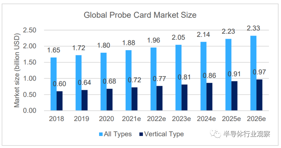 据 VLSI 报告指出 2018 年全球探针卡市场规模为 16.5 亿美金,并将于 2024 年达到 20 亿美金以上,年增长率超过 4%。半导体整体行业增长带动了封装测试的探针卡使用量增加,而其中先进探针卡(Advanced Probe Cards)是增长的主要动力。