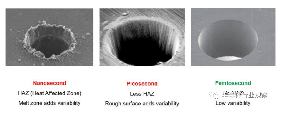 我们为探针卡行业常见材料开发专属工艺,极大化氮化硅、氧化铝、氧化锆等材料加工效率。这使得我们的集成方案可以在 2 秒内加工尺寸 35 x 35um 的方孔,其圆角仅 3.5um,可实现间距为 7um;加工周围区域的热影响层小至可忽略不计。