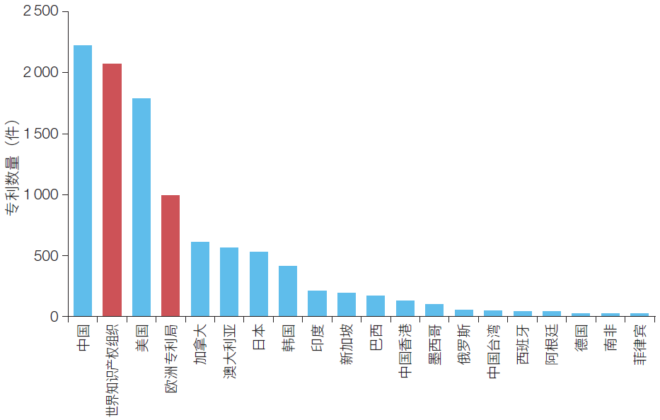 图 2 CRISPR 技术专利受理数量排名前20 的国家(地区)/ 组织