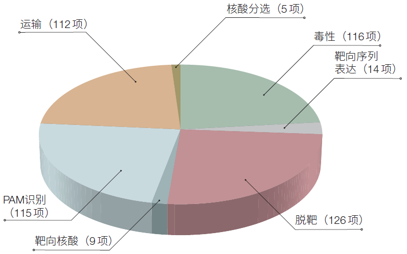 为了解 CRISPR 相关专利最多的发明人——美国麻省理工学院张锋的研究方向及专利保护情况,特对张锋的专利进行了初步标引,其标引点集中于脱靶、识别、修复和序列表达等。笔者团队还对标引的专利进行了数量的统计分析(图 6)。针对 CRISPR 技术在脱靶、识别、运输、分选、修复、减少毒性及序列表达等方向均存在非常多的技术薄弱点,且技术之间具备较强的相关性,张锋团队专利技术并未集中于某一些点,且单个专利技术通常涉及多个技术点并跨越多个方向。