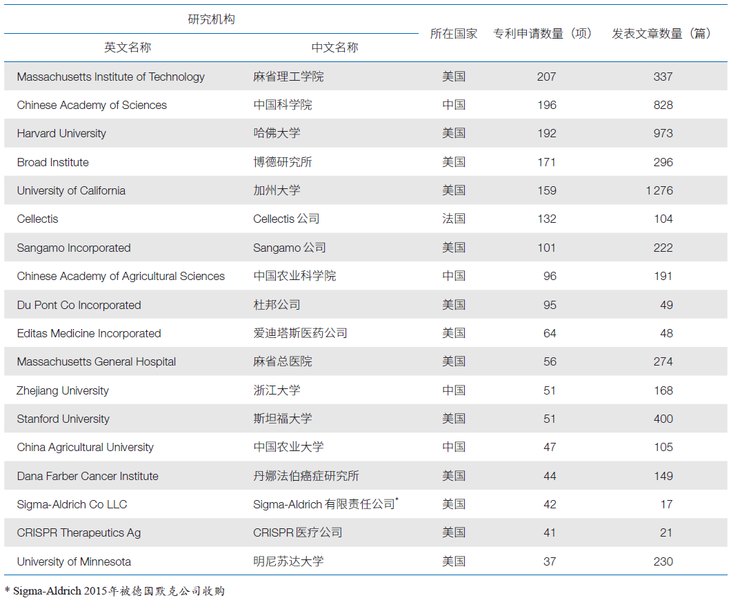 表 1 全球基因编辑领域专利申请数量前 20 位的机构及其发表文章数量