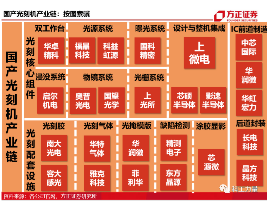 具体而言,上海微电子将交付的28nm光刻机,由其自身负责光刻机设计和总体集成,科益虹源提供光源系统,国望光学提供物镜系统,国科精密提供曝光光学系统,华卓精科提供双工作台,启尔机电提供浸没系统。