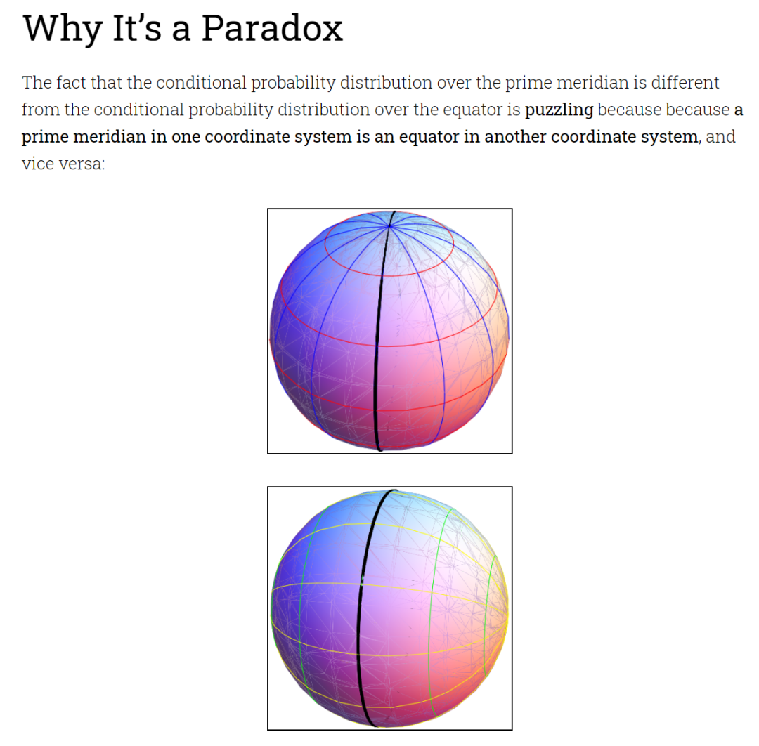 这个奇怪的发现可以用纬度圈越接近赤道越大来解释。然而这个结果似乎很荒谬,因为我们可以旋转球体,把它的赤道变成子午线。科尔莫戈洛夫表明大圆具有的度量值为零,因为它是线段,其面积为零,他通过表明无法严格计算这些概率,有效地解释了大圆悖论。