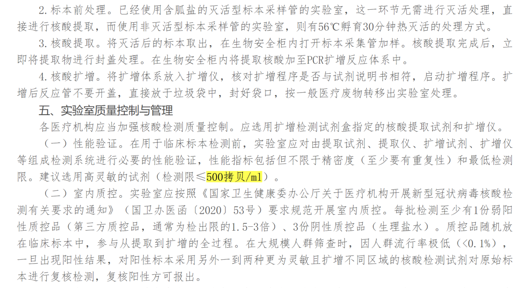 在2020年12月30日,国家卫健委出台了《医疗机构新型冠状病毒核酸检测工作手册(试行第二版)》。《手册》建议医疗机构选用高灵敏的核酸检测试剂,即检测下限需到达500拷贝/mL[5]。