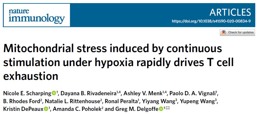 近日,美国匹兹堡大学Greg M. Delgoffe团队在Nature Immunology期刊发表题为”Mitochondrial stress induced by continuous stimulation under hypoxia rapidly drives T cell exhaustion”的研究论文。他们通过建立一种体外系统,模拟持续性抗原刺激T细胞和缺氧如何在T细胞免疫衰竭中发挥作用。他们发现,在缺氧情况下起源于线粒体的代谢压力反而可以加速细胞的终末分化,提高T细胞的活性氧(ROS)水平,造成严重的T细胞功能异常与衰竭。因此,降低T细胞内在的ROS和缓解肿瘤细胞的缺氧环境,便可以有效阻断T细胞免疫衰竭,达到与肿瘤免疫疗法的协同抗癌作用。