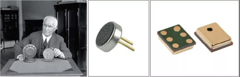 与时俱进的语音传感器。自从19世纪E. Berliner (左),T. Edison和D. Hughes首次发明了碳粒麦克风以来,语音传感器经历了很大进展;(中)驻极体电容麦克风;(右)MEMS电容式麦克风