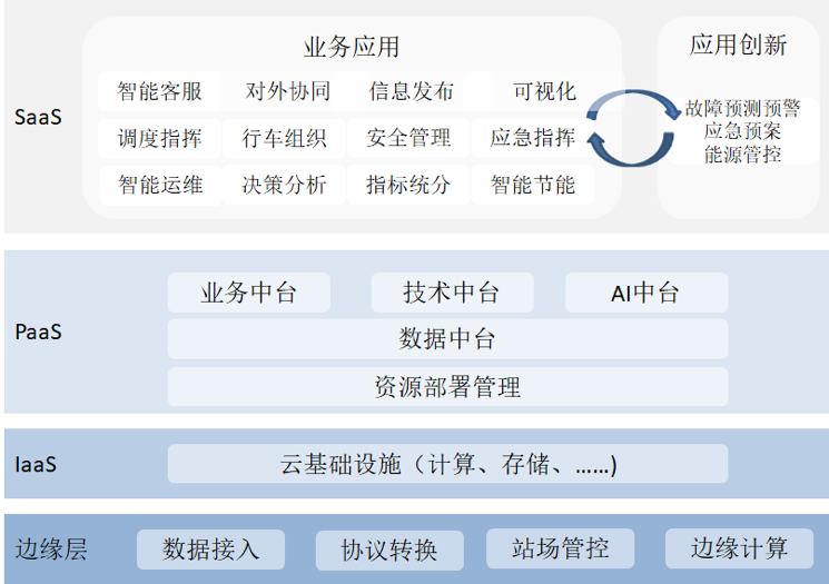 基于工业互联网,面向地铁运营“数字化、智能化、网络化、协同化”的需求,构建基于海量数据采集、汇聚、分析的服务体系,由边缘计算平台、技术中台、业务中台、数据中台、AI中台及智慧应用构成。