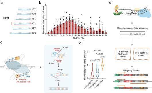 图:植物高效引导编辑设计策略。(a,b)PBS的Tm值指导pegRNA设计的示意图及其对PPE在水稻中编辑效率的影响。(c,d)双pegRNA策略的示意图及其对PPE编辑效率的提升。(e)PlantPegDesigner在线设计网站的工作流程。(课题组供图)