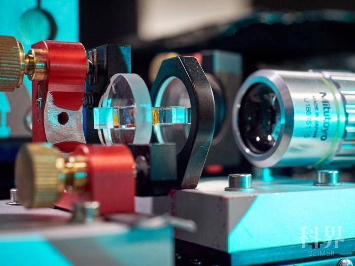 充满染料溶液的光学微共振器,右边是一个显微镜物镜,用于观察和分析共振器发出的光