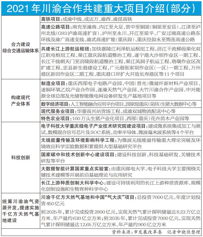 4月27日,市发展改革委发布消息称,经推动成渝地区双城经济圈建设联合办公室2021年第1次主任调度会议审议,2021年川渝合作共建重大项目有67个,总投资1.57万亿元,年度计划投资1016亿元。