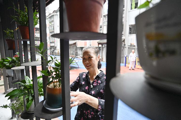 5月11日,南岸区铜元局长江村,原本的棚户区如今大变样,居民李富芳在房屋前整理花盆。记者 谢智强 摄/视觉重庆