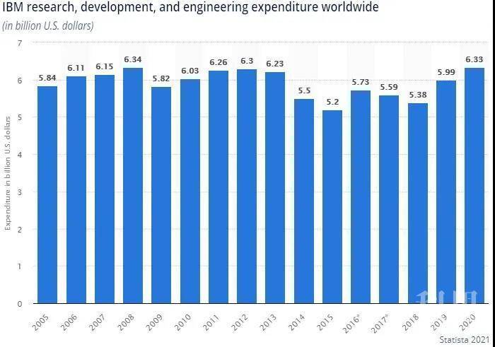 IBM之所以无法盈利的部分原因(按照该词的短期会计含义)是因为它在研发方面投入了相当大的资金,如下表所示,甚至在出售业务后,IBM还维持了该投资水平,甚至增加了投资水平。