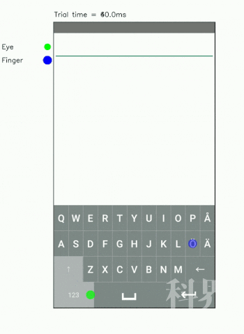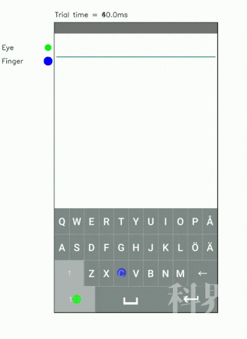 AI模拟使用带拼写检查的键盘时,眼睛和手指的移动。其中,蓝色和绿色分别代表眼睛和手指的运动轨迹。
