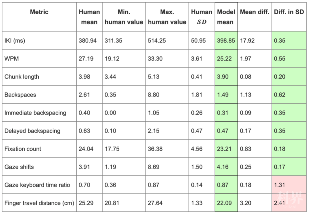 每分钟输入字数(WPM)总体上接近人类数据的平均值,两次按键输入之间花的时间(IKI)也接近人类的数据。