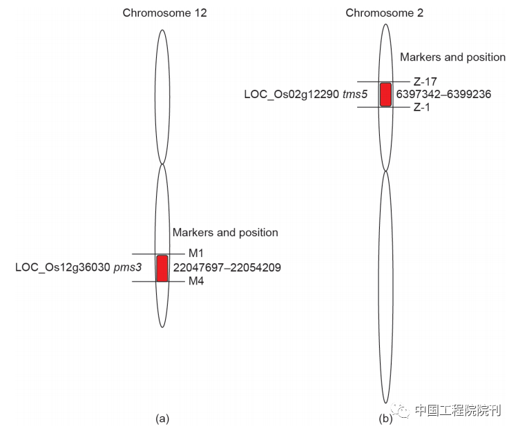其中,pms3是位于第12号染色体上的一个非编码RNA基因的单碱基突变,该基因使长日照特异雄性育性关联RNA(long-day–specific male-fertility–associated RNA, LDMAR)在长日照条件下转录量降低,并造成“农垦58S”花药程序化死亡提前,导致雄性不育。pms3是粳型光温敏核不育系的最重要不育基因源[图6(a)]。1991年,研究人员将“农垦58S”光敏核不育基因转育到籼稻中,育成第一个籼型光温敏核不育系“培矮64S”。1994年,研究人员又育成第一个两系法杂交中籼组合,两系法杂交水稻第一代骨干亲本“培矮64S”的培育获得2001年中国国家科技进步奖一等奖。