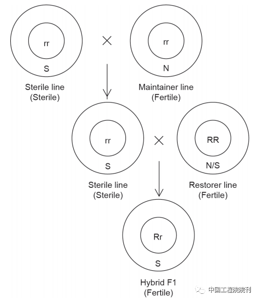 图3 “三系”配套原理图。S:细胞质雄性不育因子;N:细胞质雄性可育因子;R:雄性育性恢复显性基因;r:雄性育性恢复隐性基因