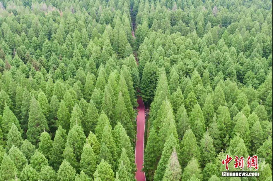 资料图:航拍江苏盐城东台黄海森林公园初夏好时光,整齐划一的树木组合成一幅美妙绝伦的湿地长廊风景画。泱波 摄
