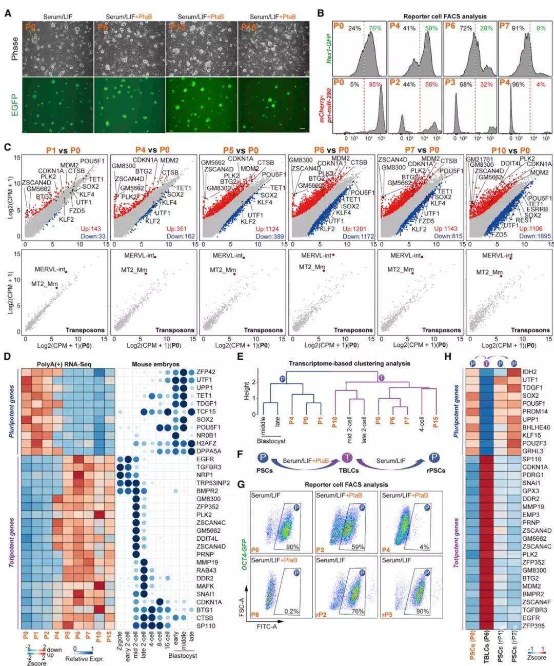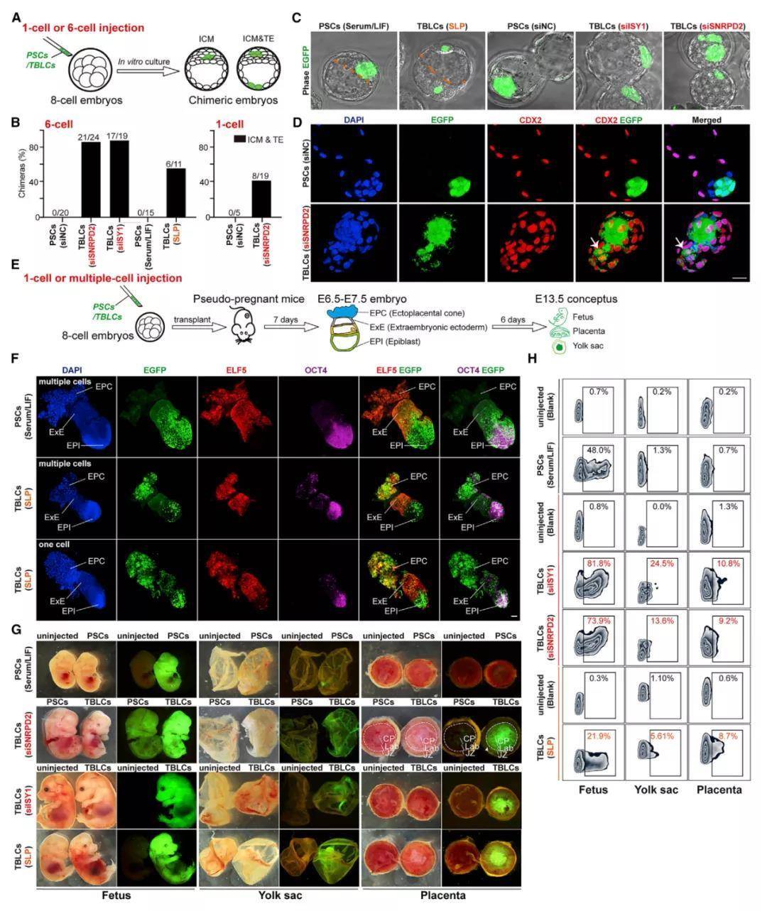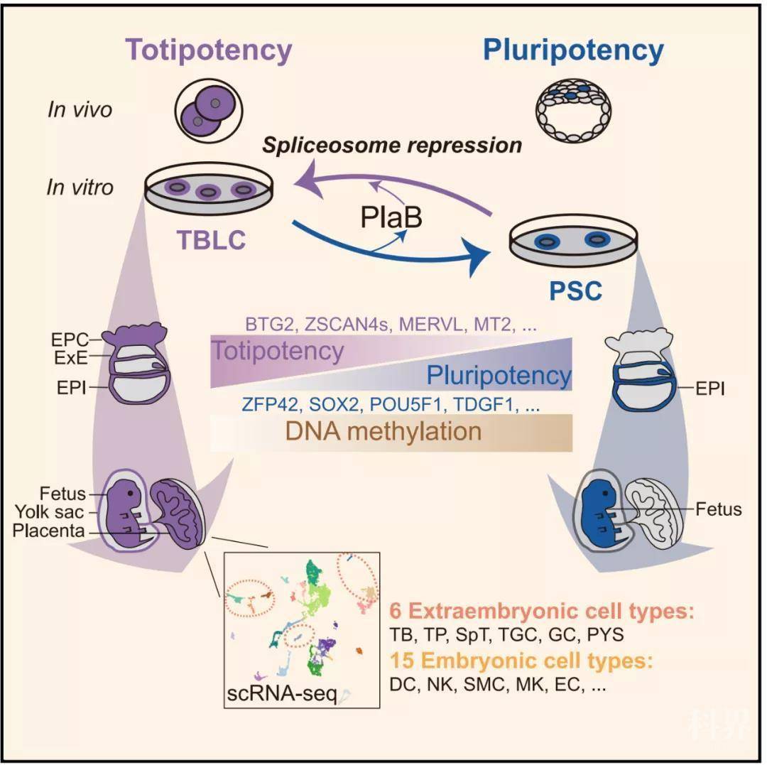 在分子水平,TBLCs也具有类似于2-和4-细胞卵裂球的表观基因组。而且多能性/全能性细胞转化可以通过单一剪接抑制剂PlaB来操纵。在功能上,在嵌合胚胎中TBLCs可以分化为内细胞团(ICM)和滋养外胚层(TE),且在嵌合E6.5-E7.5胚胎中产生了外胚层(EPI)、胚外外胚层(ExE)和胎盘外锥体(EPC)组织。