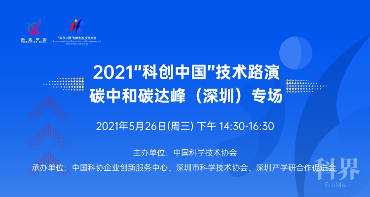 5月26日下午,2021“科创中国”技术路演——碳达峰碳中和(深圳)专场活动在“科创中国”平台和深圳湾科技生态园线上线下同步举行,活动以“智创中国 点亮梦想”为主题,由中国科学技术协会、深圳市人民政府指导,中国科协企业创新服务中心、广东省科学技术协会、深圳市科学技术协会、深圳产学研合作促进会承办。近41万人次线上观看技术路演。