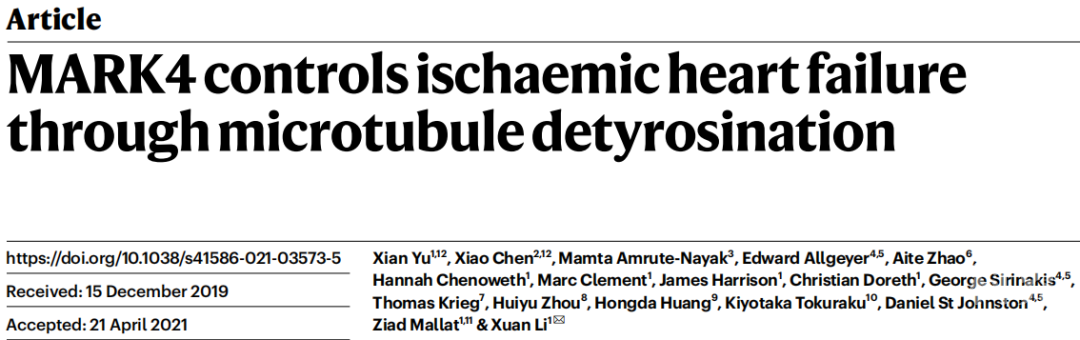 北京时间2021年5月26日晚23时,英国剑桥大学临床医学院李璇课题组在Nature杂志发表论文——“MARK4 controls ischaemic heart failure through microtubule detyrosination”。