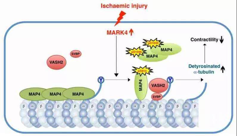 该研究组发现,在心梗后,微管结构上的微管蛋白羧肽酶VASH2占位主要是由于微管结构上的微管结合蛋白MAP4让位导致的,这样便增加了微管蛋白羧肽酶VASH2在微管上的接触机会和其相应导致的微管去酪氨酸修饰。研究进一步发现,心梗之后,微管结合蛋白MAP4在微管结合位点上的磷酸化会导致其在微管结构上的让位和脱落,然后在细胞浆内形成多聚体,一种类似于tau蛋白在神经退行性病变里形成的聚合结构。