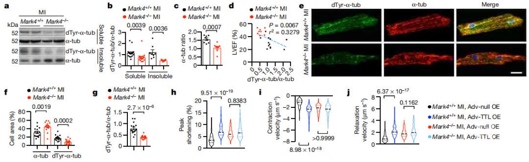 实验进一步证实,MARK4基因敲除的小鼠在心梗后,在原代心肌细胞中MAP4在微管结合位点不会被磷酸化,从而让其可以继续在微管上保持占位。MAP4在微管上的持续占位会让微管蛋白羧肽酶VASH2没有机会来接触微管将其去酪氨酸化而导致肌小节的收缩僵化,因而MARK4基因敲除的小鼠在心梗后展示了依旧强大的心肌收缩能力。