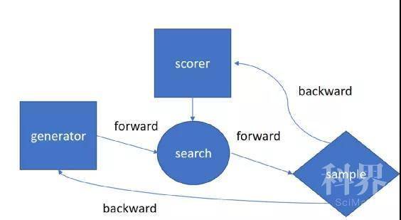 如上图所示,其中,生成器会负责生成大量的诗句 candidate,用 scorer 去判断这些诗句的好坏、search 出比较好的诗歌之后,能够得到的较优质的诗歌 sample,它们会比经过比生成器直接生成的要好,再用这些优质的诗歌 sample 去重新 finetune 生成器。
