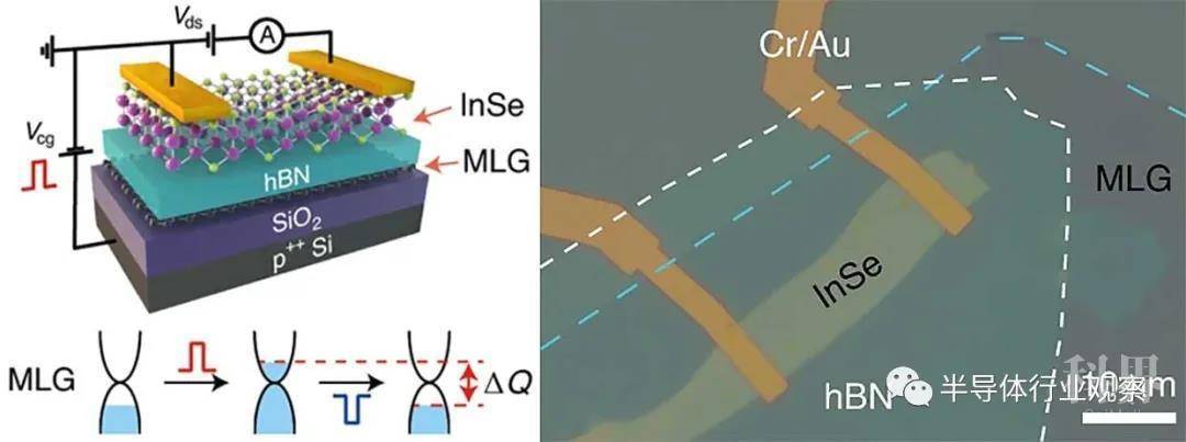 研究人员制造了van der Waals异质结构,该结构由硒化铟(indium selenide)半导体层,六方氮化硼(hexagonal boron nitride)绝缘层和位于二氧化硅和硅晶圆顶部的多个导电石墨烯层组成。仅持续21纳秒的电压脉冲可以将电荷注入石墨烯以写入或擦除数据。这些脉冲的强度与商用闪存中用于写入和擦除的脉冲的强度大致相同。