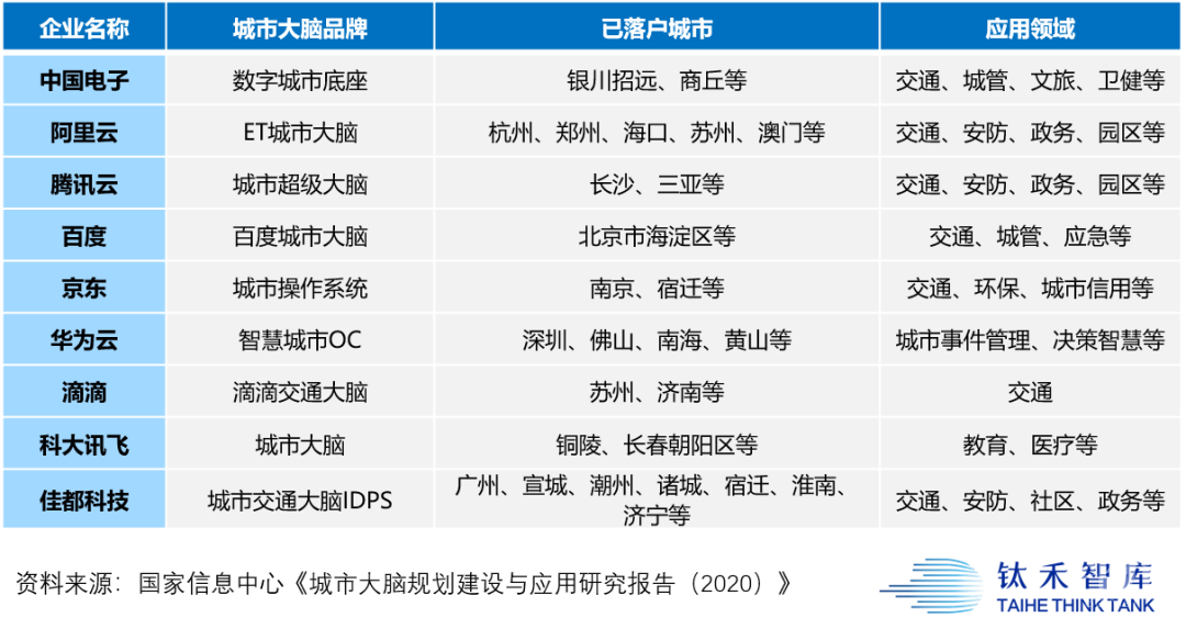 部分知名科技企业参与建设的城市大脑