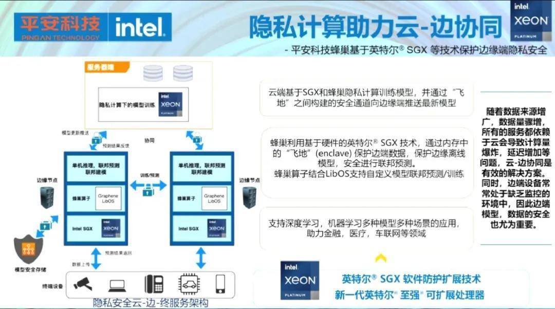 由于金融领域的数据敏感性,联邦学习技术受到金融行业的重视。国内金融行业在做AI应用的时候,迫切需要通过隐私保护技术加密的数据交换。搭载英特尔在AI业界开源的技术Analytics Zoo,中国银联实践端到端数据交互网络,并实施基于英特尔软件防护扩展(SGX),进一步加强保护联邦学习的整体方案。2020年,英特尔与平安科技就基于Ice Lake前期样品进行深度合作,实现了基于英特尔SGX技术加持的云边协同的隐私计算实践方案。此外,在对医疗数据敏感的欧美,德国的电子医保数据正在利用英特尔SGX,完成远程数据加载。在SGX提供的可信任的执行环境里,对德国2600万医保用户可存储信息以及进行隐私集合求交,以及满足对数据进行联合运算的需求。英特尔表示,可将联邦学习看作金融行业保护资金实现的规章制度,SGX可看作金库的库房,这两者可以相互配合、有机结合。