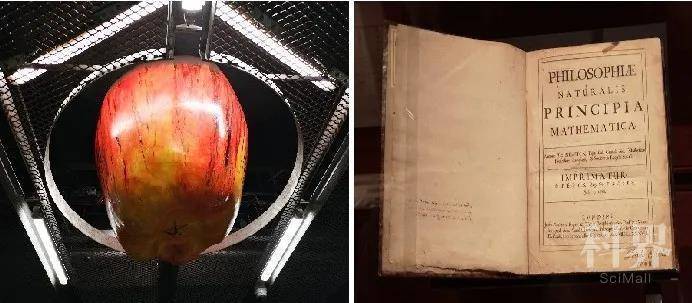 图8. (左)KTH地铁站台上悬挂的巨大苹果;(右)《自然哲学之数学原理》拉丁文首版扉页(点击看大图)