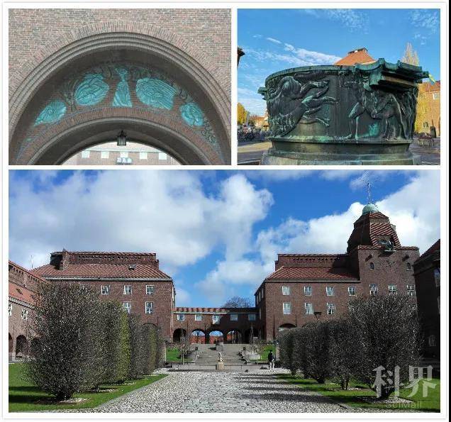 图10中左上图的半圆形拱门通往大学主建筑,门楣浮雕是瑞典著名雕塑家卡尔·米勒斯的作品,表现人类与火、土、气、水四种元素的抗争,这一浮雕与地铁站台的正多面体(图2下)上下呼应。右上图是校园里米勒斯的另一作品——青铜喷泉雕塑"工业纪念碑", 表达了对瑞典工业化的礼赞。其设计灵感源自古希腊的饮用器皿,这个大碗碗壁上的浮雕是古希腊神化故事中的阿玛宗女杰及逐猎半人马的野狗,基座上是木匠、铁匠、裁缝、鞋匠众雕像,凸显工匠精神。根据米勒斯的说法,大碗象征水利发电,有水从下方三个孔流出。而这一创意似乎不为众人理解,百余年来瓜众们给它起了不少外号,如"汤盆" "蘑菇碗" "米勒斯的痰盂"等,其实在汉语语境里,就是一个青铜大鼎。