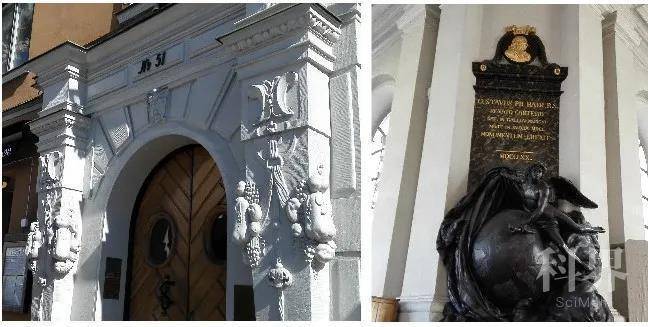 作为一名逝于新教国家的天主教徒,笛卡尔被临时安葬在一个主要用于埋葬受洗前夭折的婴儿墓地里,17年后他的遗体移葬巴黎。100多年之后,在笛卡尔最初的埋骨之地上建起了以时任瑞典国王Adolf Fredrik名字命名的教堂,教堂内悬挂着当时的瑞典王太子、后来的国王古斯塔夫三世(Gustav III)于1770年设立、由雕塑家Johan Tobias Sergel创作的笛卡尔纪念碑。纪念碑的下方雕塑是一位有翅膀的天才,左手持火炬,右手揭开地球上的覆盖物,表示将真理从谎言中解放出来 (图7右)。故事到这里还没有结束,1667年,笛卡尔的遗体运回巴黎时,由于灵柩狭小,头骨被留了下来,最后不知所终。直到19世纪初,瑞典著名化学家Jöns Jacob Berzelius在斯德哥尔摩的一家拍卖行将笛卡尔的头骨购回,现存巴黎夏乐宫人类学博物馆。