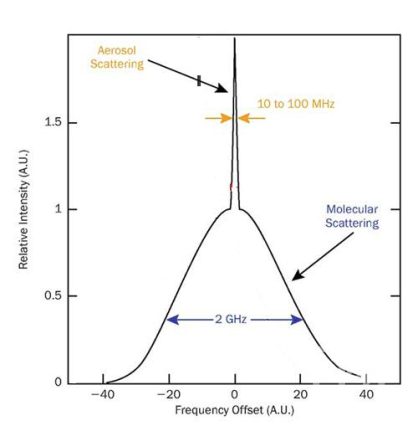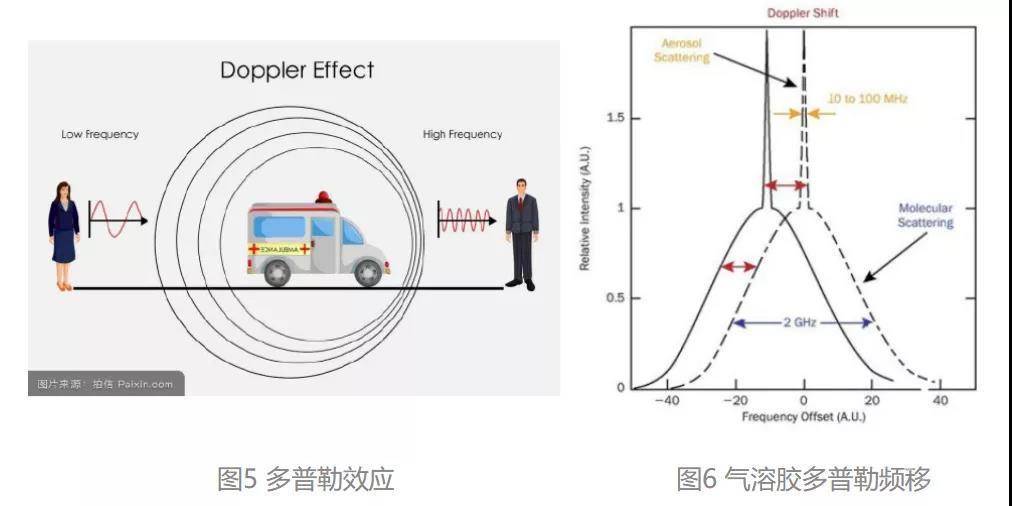 激光测风雷达主要利用激光的多普勒效应(如图5),测量出大气中气溶胶粒子后向散射信号的多普勒频移(如图6),可以实现对大气风速的测量。采用的激光器多为1550 nm的单频光纤激光器,该类型激光器国内多所科研院所及公司均已实现批量生产。