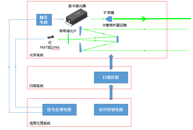 激光雷达由激光发射机、光学接收机、转台和信息处理系统等组成。激光器将光脉冲发射出去,通过转台将激光打向不同的方向,光接收机再把从目标反射回来的光脉冲还原成电信号,送到信息处理系统。