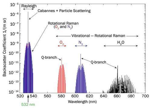 拉曼激光雷达主要利用大气中特殊成分的拉曼效应(非弹性散射)来分析大气的温度、湿度、物质成分等物理量。多采用波长为532 nm、355 nm灯泵激光器,能量需要几十甚至几百毫焦。此类型激光器目前多为进口,国产设备在稳定性上还有所欠缺。典型的拉曼信号如图3所以,峰频移对应物质成分,峰强度对应物质含量。
