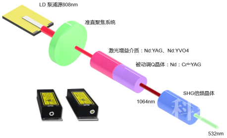 微片激光器是以微晶片晶体材料(典型厚度为mm量级)为激光工作物质,并在其端面镀膜直接构成谐振腔,将LD芯片快、慢轴整形后作为泵浦源直接泵浦微片晶体,整体激光器系统体积小巧,结构紧凑。因此,微片激光器也叫微型激光器。