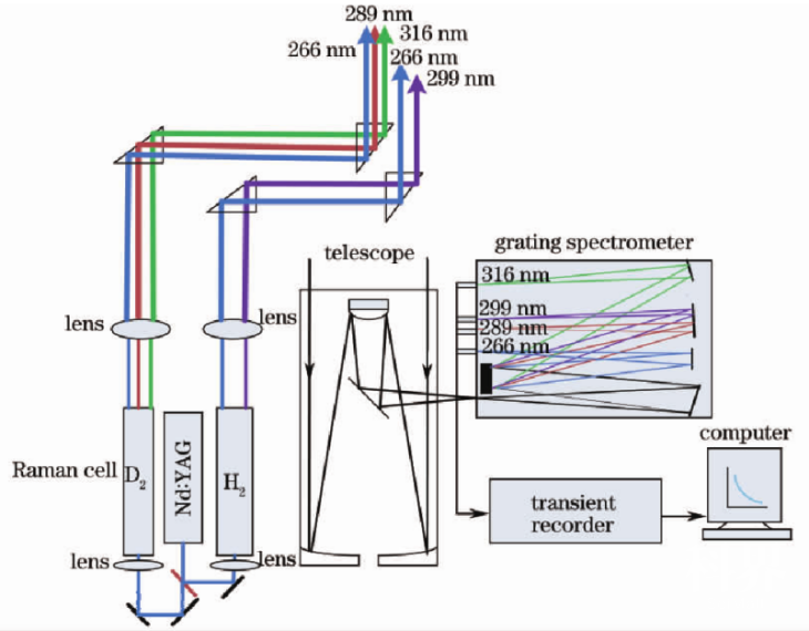 差分吸收激光雷达采用差分吸收原理,发射、接收多波长紫外(多为266 nm、289 nm、299 nm和316 nm等),分析大气中污染气体含量,多用于近地面臭氧监测以及氮氧化物测量。