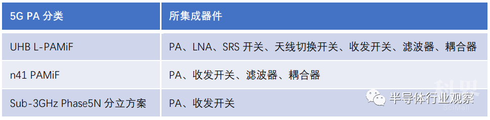 目前国产厂商所发布的5G PA主要也可以大致分为三类:UHB L-PAMiF、n41 PAMiF、Phase5N分立。