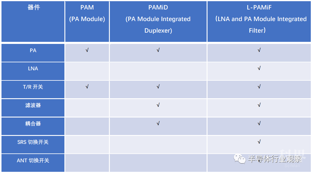 下表列出了常见的收发模组对比,4G LTE方案中常用的是PAM和PAMiD,分别对应高性价比方案和高性能方案。而n77/78/79双频L-PAMiF是目前5G NR集成度最高的商用芯片之一。