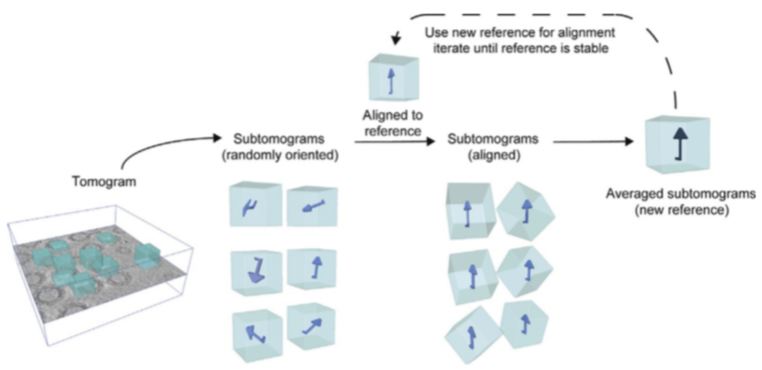 图7. 子断层平均法的示意图。Cryo-ET获得的断层成像中,相同蛋白所在的子断层被裁剪出来,并对齐到同一方向。这时,将所有子断层的信号进行叠加就能获得高信噪比的三维重构[6]。