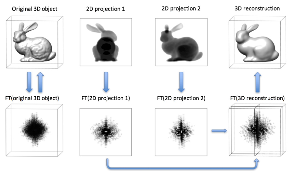 图4. 中心截面定理的示意图,三维的兔子被投影成二维照片后做傅里叶变换,与三维兔子直接做傅里叶变换后垂直投影方向的截面是一样的。(图片来自于牛津大学cryo-ET workshop课件)