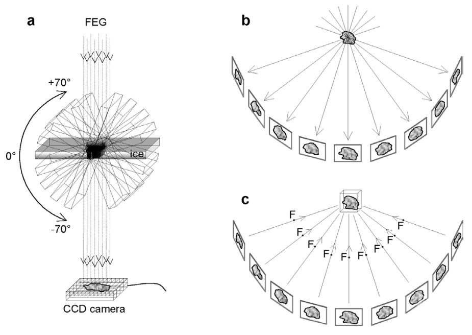 图5. cryo-ET成像示意图。(a)FEG表示电子枪,用于发射电子。CCD camera相机用于采集照片。光路下的样品被一边旋转一边拍摄;(b)表示对同一个物体进行了不同角度的拍摄;(c)代表通过这些不同角度的照片重构出物体原本的结构(Gruenewald et al., 1993)。