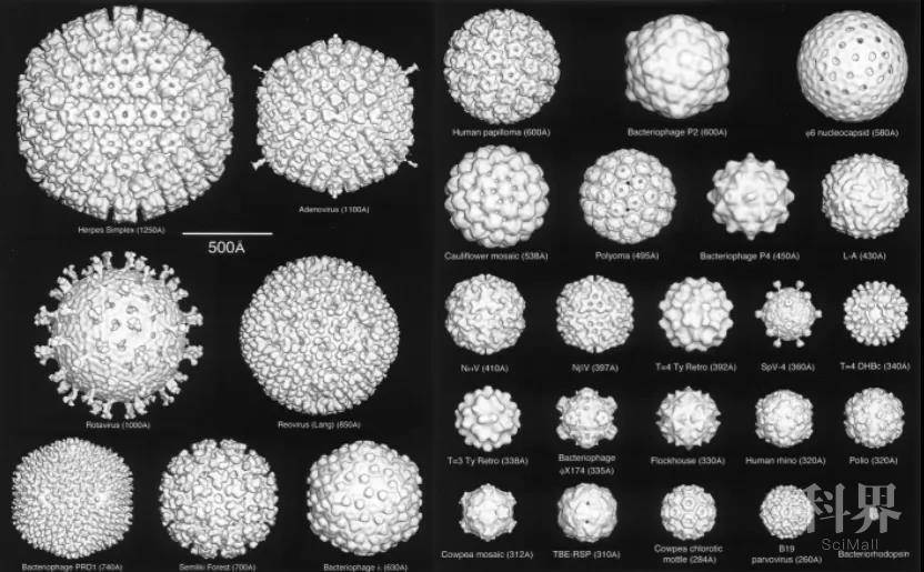 图1. 使用冷冻电镜解析的正二十面体型病毒的结构比较[1]。